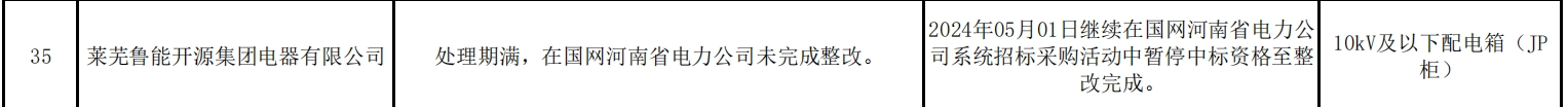 其中,莱芜鲁能开源集团电器有限公司因处理期满,在国网河南省电力公司未完成整改。处理措施:2024年05月01日继续在国网河南省电力公司系统招标采购活动中暂停中标资格至整改完成。处理范围:10kV及以下配电箱(JP柜)。