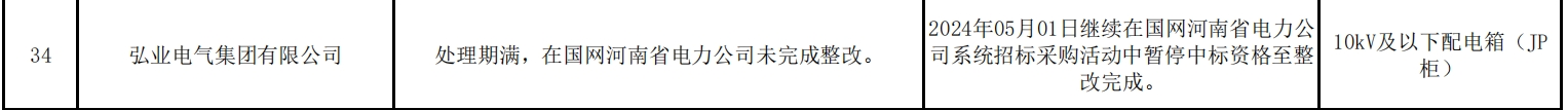 其中,弘业电气集团有限公司因处理期满,在国网河南省电力公司未完成整改。处理措施:2024年05月01日继续在国网河南省电力公司系统招标采购活动中暂停中标资格至整改完成。处理范围:10kV及以下配电箱(JP柜)。