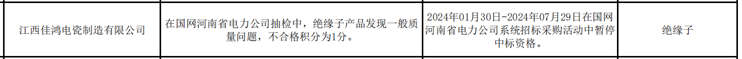 公告显示,江西佳鸿电瓷制造有限公司,在国网河南省电力公司抽检中,绝缘子产品发现一般质量问题,不合格积分为1分。