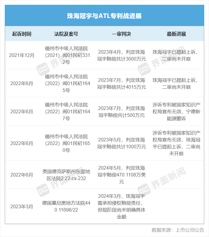 根据界面新闻统计,双方的专利诉讼中,共计六起案件作出一审宣判,珠海冠宇均败诉,并被判作出赔偿。