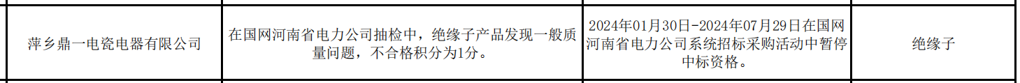 公告显示,萍乡鼎一电瓷电器有限公司,在国网河南省电力公司抽检中,绝缘子产品发现一般质量问题,不合格积分为1分。