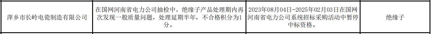 公告显示,萍乡市长岭电瓷制造有限公司,在国网河南省电力公司抽检中,绝缘子产品处理期内再次发现一般质量问题,处理延期半年,不合格积分为1分。