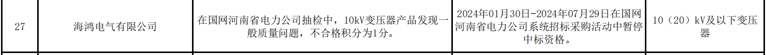 其中,海鸿电气有限公司因在国网河南省电力公司抽检中,10kV变压器产品发现一般质量问题,不合格积分为1分。处理措施:2024年01月30日-2024年07月29日在国网河南省电力公司系统招标采购活动中暂停中标资格。处理范围:10(20)kV及以下变压器。