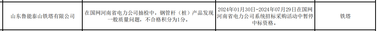 相关处理措施为,2024年01月30日-2024年07月29日在国网河南省电力公司系统招标采购活动中暂停中标资格。处理范围为,铁塔。