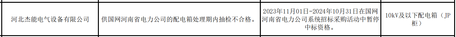 公告显示,河北杰能电气设备有限公司,在供国网河南省电力公司的配电箱处理期内抽检不合格。