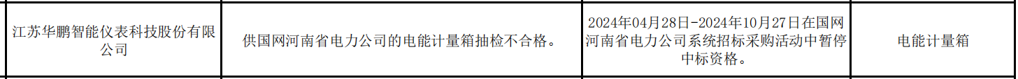 公告显示,江苏华鹏智能仪表科技股份有限公司,在供国网河南省电力公司的电能计量箱抽检不合格。