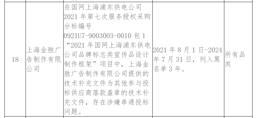其中,上海金胜广告制作有限公司在国网上海浦东供电公司2021年第七次服务授权采购分标编号0921U7-9003003-0010包1“2021年国网上海浦东供电公司品牌标志类宣传品设计制作框架”项目中,提供的技术补充文件为其他参与投标供应商落款盖章的技术补充文件,存在涉嫌串通投标问题。处理措施:2021年8月1日-2024年7月31日,列入黑名单3年。处理范围:所有品类。