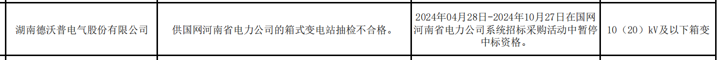 公告显示,湖南德沃普电气股份有限公司,在供国网河南省电力公司的箱式变电站抽检不合格。