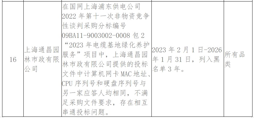 其中,上海通昌园林市政有限公司在国网上海浦东供电公司2022年第十一次非物资竞争性谈判采购分标编号09BA11-9003002-0008包2“2023年电缆基地绿化养护服务”项目中,提供的投标文件中计算机网卡MAC地址、CPU序列号和硬盘序列号与另一家应答人均相同,不满足采购文件要求,存在相互串通投标问题。处理措施:2023年2月1日-2026年1月31日,列入黑名单3年。处理范围:所有品类。