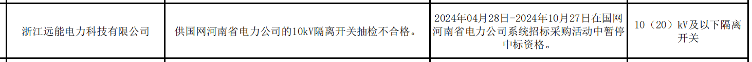 公告显示,浙江远能电力科技有限公司,在供国网河南省电力公司的10kV隔离开关抽检不合格。