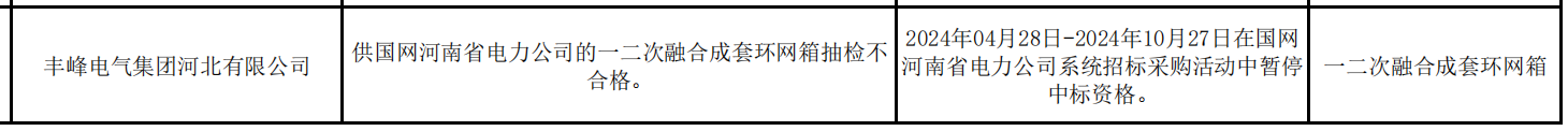 公告显示,丰峰电气集团河北有限公司,在供国网河南省电力公司的一二次融合成套环网箱抽检不合格。