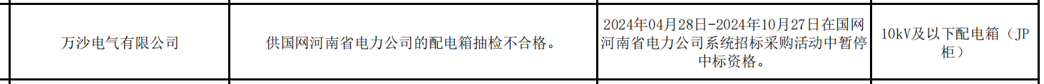 公告显示,万沙电气有限公司,在供国网河南省电力公司的配电箱抽检不合格。