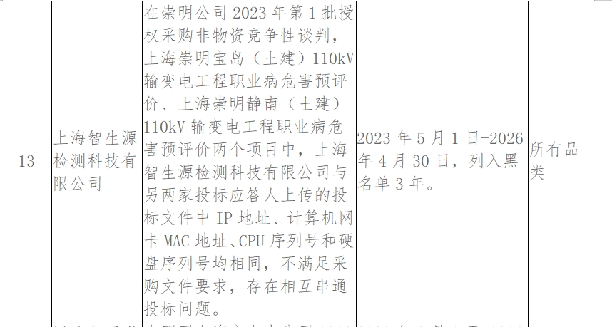 其中,上海智生源检测科技有限公司在崇明公司2023年第1批授权采购非物资竞争性谈判,上海崇明宝岛(土建)110kV输变电工程职业病危害预评价、上海崇明静南(土建)110kV输变电工程职业病危害预评价两个项目中,与另两家投标应答人上传的投标文件中IP地址、计算机网卡MAC地址、CPU序列号和硬盘序列号均相同,不满足采购文件要求,存在相互串通投标问题被通报。处理措施:2023年5月1日-2026年4月30日,列入黑名单3年。处理范围:所有品类。