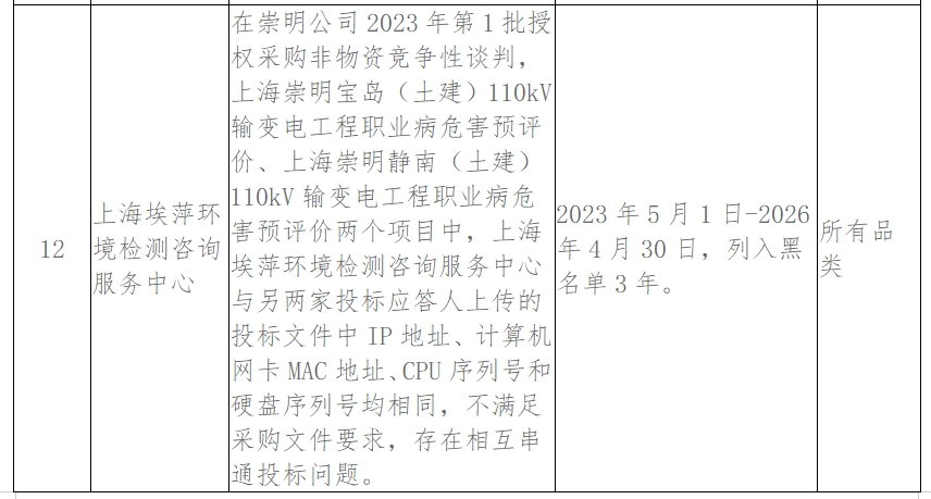 其中,上海埃萍环境检测咨询服务中心在崇明公司2023年第1批授权采购非物资竞争性谈判,上海崇明宝岛(土建)110kV输变电工程职业病危害预评价、上海崇明静南(土建)110kV输变电工程职业病危害预评价两个项目中,与另两家投标应答人上传的投标文件中IP地址、计算机网卡MAC地址、CPU序列号和硬盘序列号均相同,不满足采购文件要求,存在相互串通投标问题被通报。处理措施:2023年5月1日-2026年4月30日,列入黑名单3年。处理范围:所有品类。