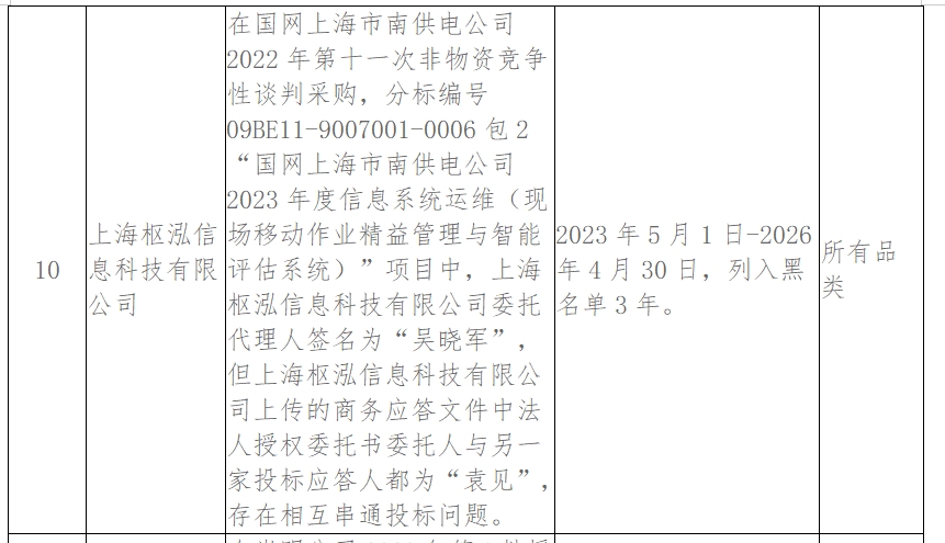 其中,安思因(上海)咨询管理有限公司因在崇明公司2023年第1批授权采购非物资竞争性谈判,上海崇明宝岛(土建)110kV输变电工程职业病危害预评价、上海崇明静南(土建)110kV输变电工程职业病危害预评价两个项目中,安思因(上海)咨询管理有限公司与另两家投标应答人上传的投标文件中IP地址、计算机网卡MAC地址、CPU序列号和硬盘序列号均相同,不满足采购文件要求,存在相互串通投标问题被通报。处理措施:2023年5月1日-2026年4月30日,列入黑名单3年。处理范围:所有品类。