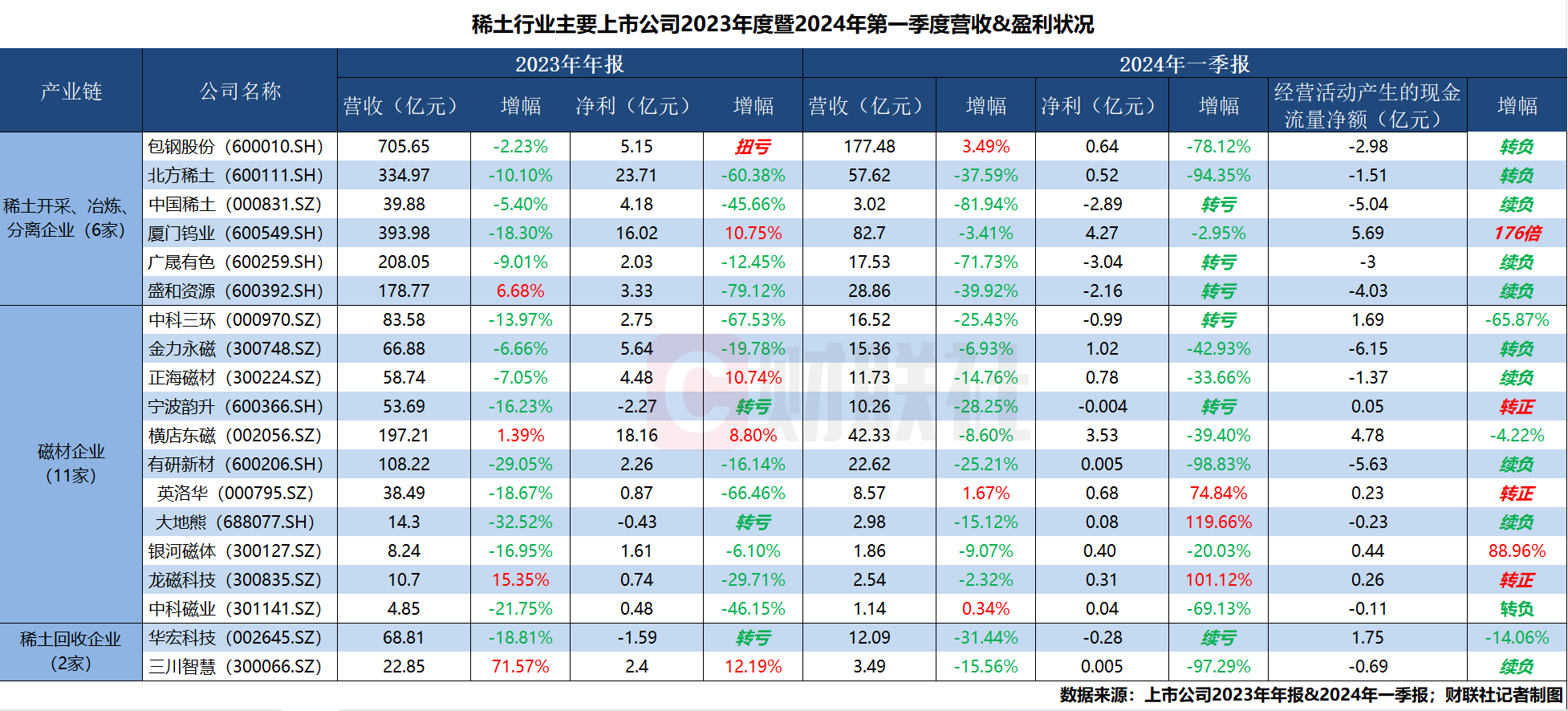进入2024年以来,从上市稀土企业发布的一季报来看,稀土行业仍面临效益大幅下滑、部分企业经营现金流处于"失血"状态,头部企业虽然产销两旺,但业绩再度承压。