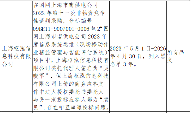公告显示,上海枢泓信息科技有限公司,在国网上海市南供电公司2022年第十一次非物资竞争性谈判采购,分标编号09BE11-9007001-0006包2“国网上海市南供电公司2023年度信息系统运维(现场移动作业精益管理与智能评估系统)”项目中,上海枢泓信息科技有限公司委托代理人签名为“吴晓军”,但上海枢泓信息科技有限公司上传的商务应答文件中法人授权委托书委托人与另一家投标应答人都为“袁见”,存在相互串通投标问题。