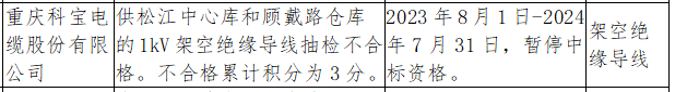 公告显示,重庆科宝电缆股份有限公司,供松江中心库和顾戴路仓库的1kV架空绝缘导线抽检不合格。不合格累计积分为3分。