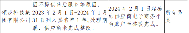 相关处理措施为,2024年2月1日起冻结供应商电子商务平台账户至整改完成。处理范围为,所有品类。