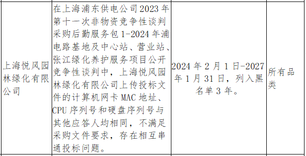 公告显示,上海悦风园林绿化有限公司,在上海浦东供电公司2023年第十一次非物资竞争性谈判采购后勤服务包1-2024年浦电路基地及中心站、营业站、张江绿化养护服务项目公开竞争性谈判中,上海悦风园林绿化有限公司上传投标文件的计算机网卡MAC地址、CPU序列号和硬盘序列号与其他应答人均相同,不满足采购文件要求,存在相互串通投标问题。