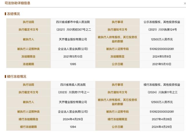 国家企业信用信息公示系统网站显示,4月29日,天齐锂业(002466)新增1条股权续行冻结信息,股权被执行的企业为成都天齐锂业有限公司,冻结股权数额1.25亿元人民币,冻结期限自2024年4月29日至2027年4月28日,执行法院为四川省高级人民法院。成都天齐锂业有限公司成立于2014年8月,法定代表人为夏浚诚,注册资本25亿人民币,由天齐锂业股份有限公司全资持股。