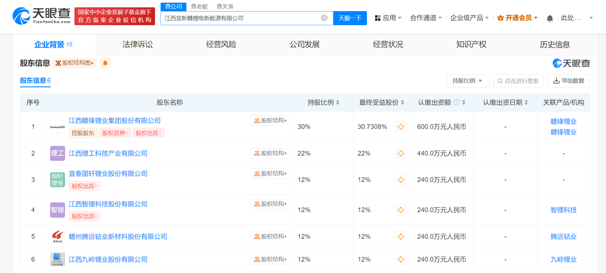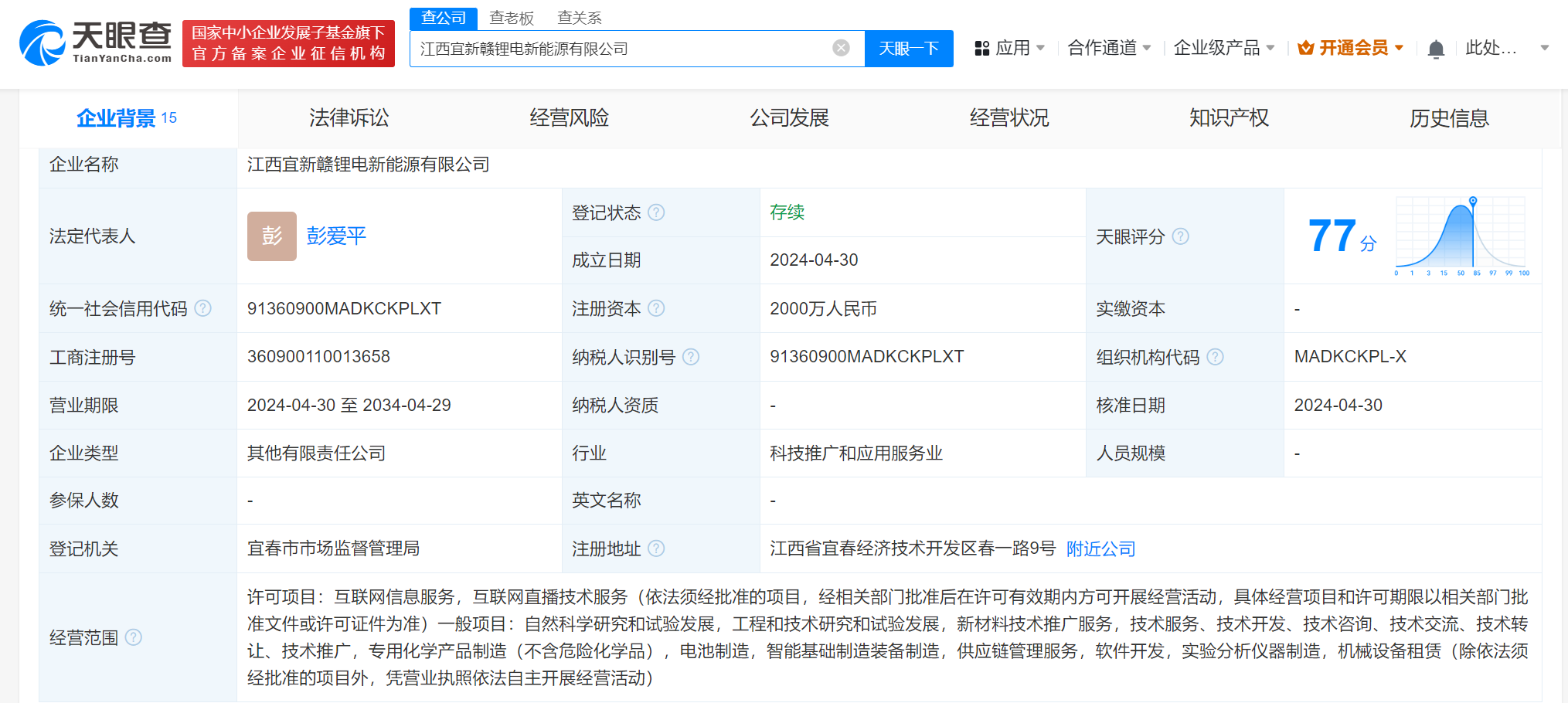 天眼查App显示,近日,江西宜新赣锂电新能源有限公司成立,法定代表人为彭爱平,注册资本2000万人民币,经营范围含自然科学研究和试验发展、工程和技术研究和试验发展、新材料技术推广服务、专用化学产品制造、电池制造、智能基础制造装备制造等。股东信息显示,该公司由赣锋锂业(002460)、江西理工科技产业有限公司、国轩高科(002074)旗下宜春国轩锂业股份有限公司、智锂科技(873906)、腾远钴业(301219)、江西九岭锂业股份有限公司共同持股。
