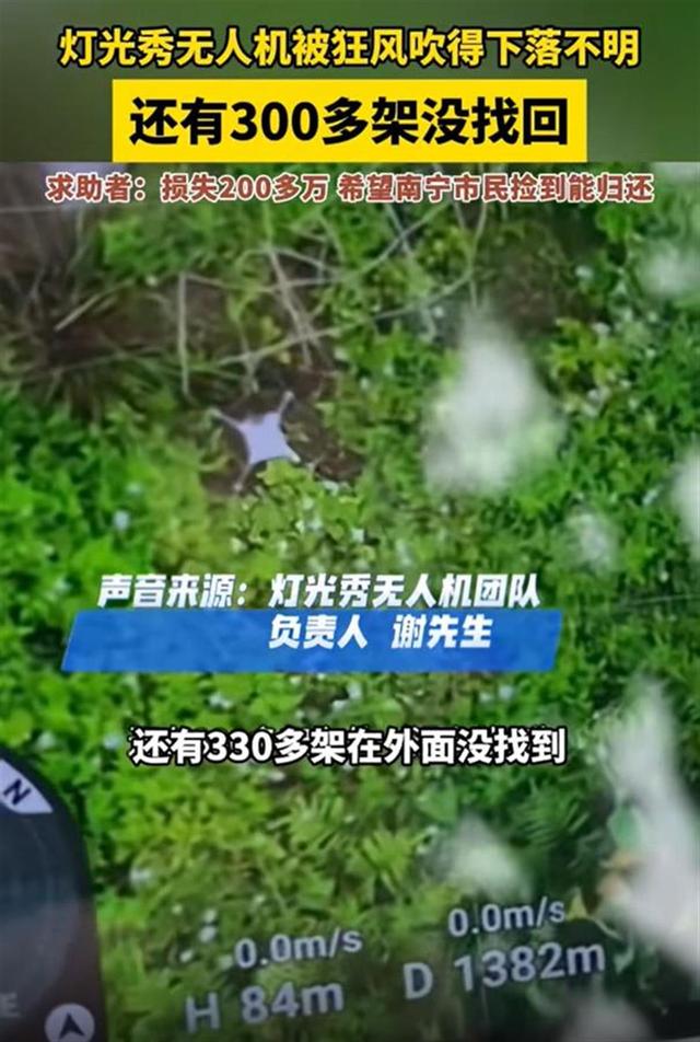 据大象新闻5月6日报道:4日晚,广西南宁,一场无人机表演因突如其来的狂风和电闪雷鸣被迫中断。400多架无人机的表演编队,在强风吹袭下,多架无人机失去控制被吹飞,损失惨重。无人机表演团队表示损失200多万元,同时呼吁,希望捡到的市民能归还。主办方也第一时间向公众表达了歉意,并承诺将采取措施尽快找回无人机,并评估受损情况,以保障未来类似活动安全稳定运行。