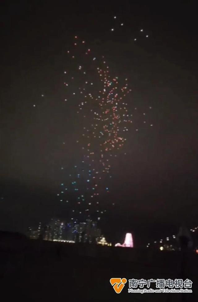 另据南国早报报道:五一节假日期间,南宁民生广场上空,也曾上演精彩绝伦的无人机灯光秀,五颜六色的闪灯依次摆出“我在南宁很想你”“凤凰”“绣球”等各式各样的图案造型,氛围感拉满!