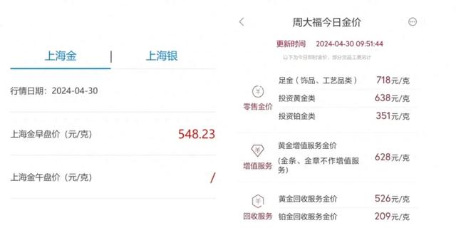 左:4月30日,上海黄金交易所官网公布的“上海金”价格;右:某品牌金店公布的今日金价。