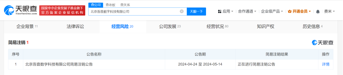 天眼查经营风险信息显示,近日,北京吾音数字科技有限公司新增一则简易注销公告,公告期自4月24日至5月14日。该公司成立于2022年6月,法定代表人为宗辉,注册资本1500万人民币,经营范围含数字文化创意软件开发、数字内容制作服务、广告发布、市场营销策划、文化娱乐经纪人服务等。股东信息显示,该公司由蓝色光标(300058)旗下蓝色宇宙数字科技有限公司、乐华娱乐旗下天津壹华管理咨询有限责任公司、宗辉、赵彤、黄子琦共同持股。