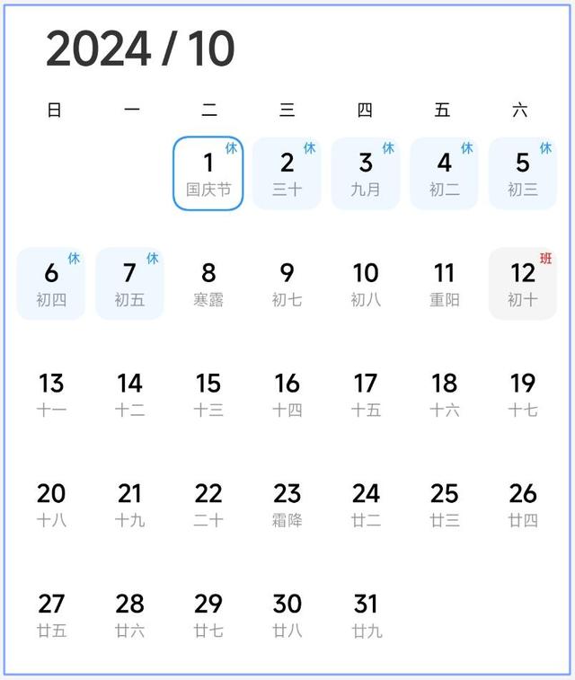 国庆节:10月1日至7日放假调休,共7天。9月29日(星期日)、10月12日(星期六)上班。