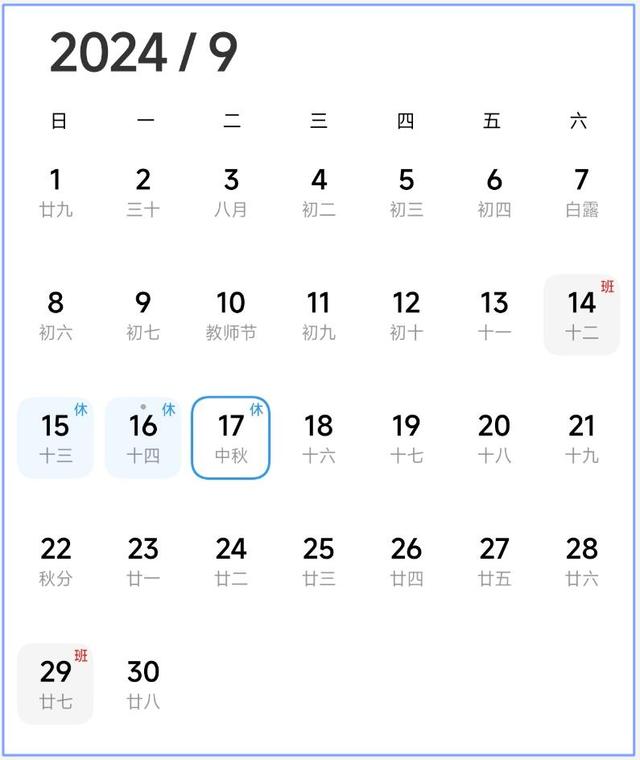 中秋节:9月15日至17日放假调休,共3天。9月14日(星期六)上班。