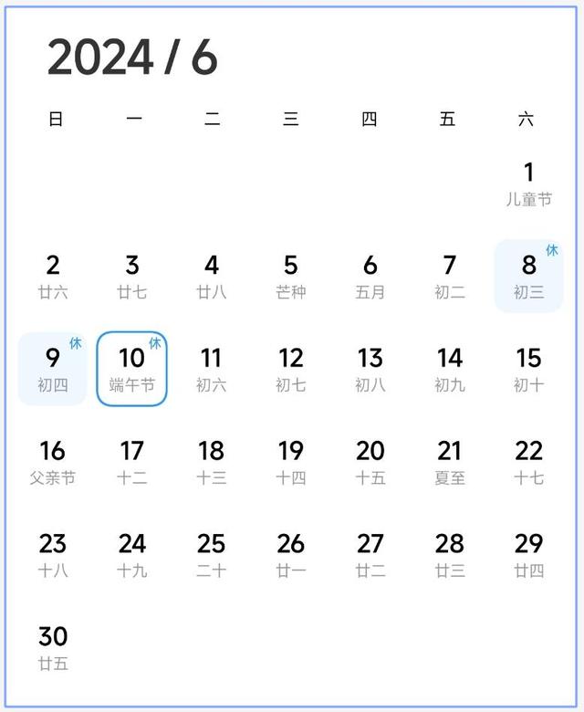 端午节:6月10日放假,与周末(6月8日、6月9日)连休,共3天。