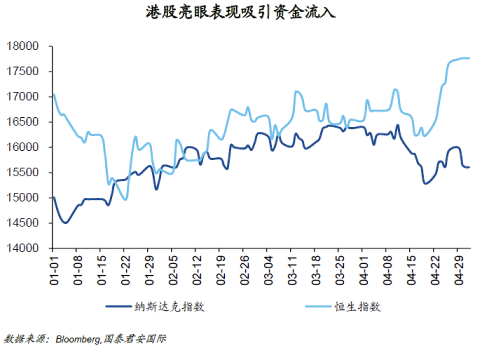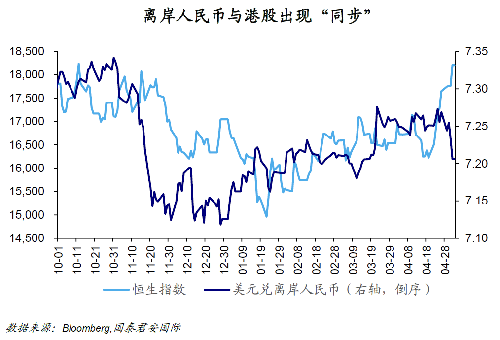 具体看来,国君国际认为,自今年4月以来,恒生指数的表现亮眼,远超美股。这在很大程度上表明市场在重新定价美国货币政策的同时,也开始在重新定价中国经济的表现。在过去几天,北京开始放松非核心区域的住房限购引发市场的关注,港股和A股的房地产板块也出现了久违的行情。而五一黄金周的出行数据无疑会得到更多的关注,总体而言,投资者对于港股的信心有明显上升。而推升这一轮港股行情的,主要是南下资金。由于港股近期表现出色,一些海外资金也开始出现加仓,市场短期对于人民币的看法也会偏正面。