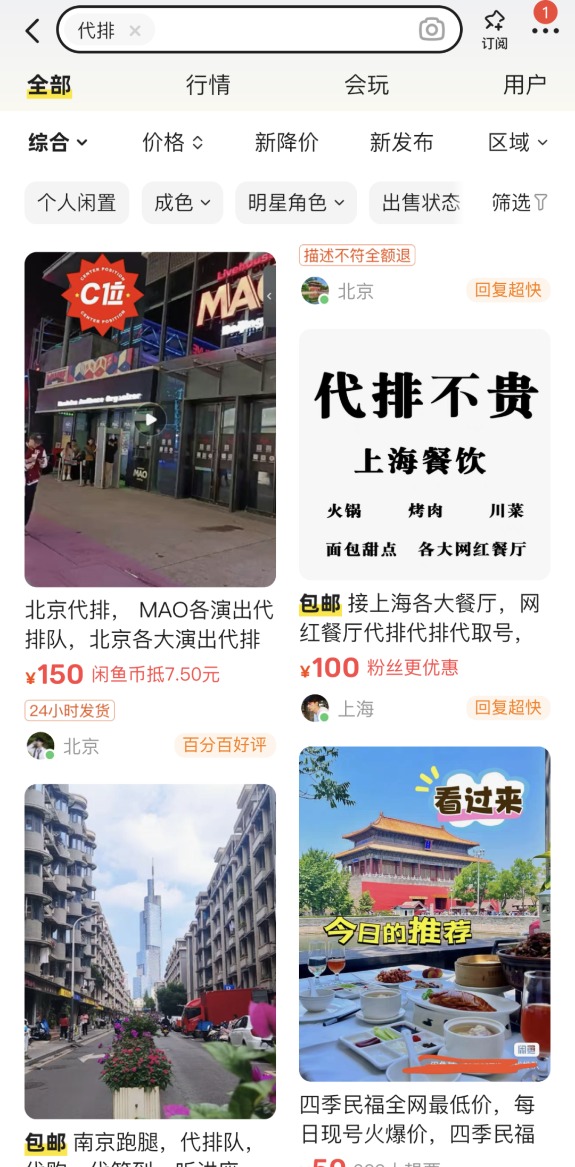 “各大演出Livehouse、音乐节、演唱会、剧院代排队”“帮没空提前去,或者不想排队‘罚站’的朋友们代排”……事实上,演唱会等场景“代排生意”更为普遍。但其中也出现代排插队、夜排严重等问题。此前,有巡演主办方发布声明称,相关行为给演出正常秩序和社会治安安全带来极大隐患,将坚决抵制。