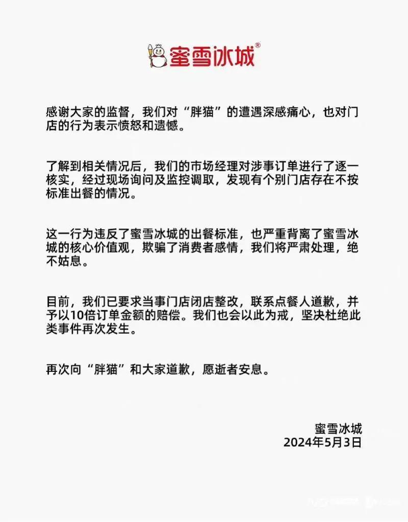 5 月 3 日晚 7 点,针对外卖中茶饮变白开水一事,蜜雪冰城通过官方微博致歉。蜜雪冰城表示,其市场经理对涉事订单进行了逐一核实,经过现场询问及监控调取,发现有个别门店存在不按标准出餐的情况。蜜雪冰城已经要求当事门店闭店整改,联系点餐人道歉,并给予以 10 倍订单金额的赔偿。蜜雪冰城将坚决杜绝此类事件再次发生。