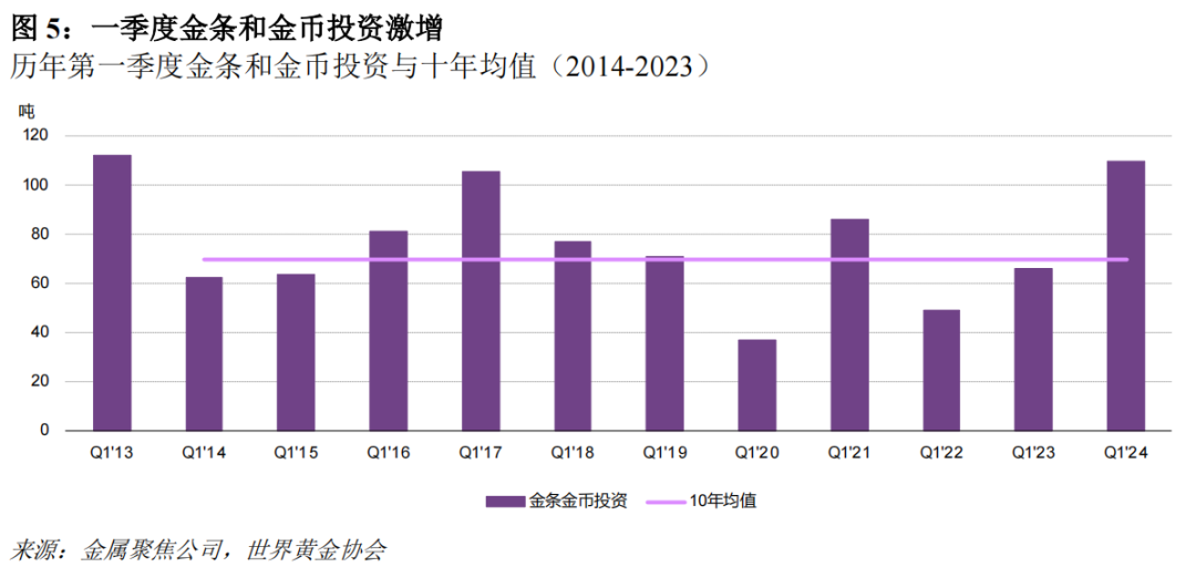 《报告》指出,2024年一季度,中国国内总体黄金需求达到了343吨,同比上升3%,超出十年均值25%有余。其中,金条金币成为支撑需求增长的主引擎,同比大增68%至110吨。