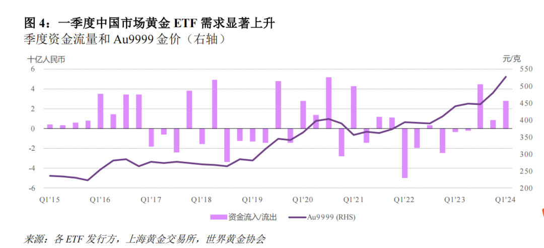 数据还显示,截至第一季度末,中国市场黄金ETF总持仓达到了67吨,季环比上升10%;而由于人民币金价的飙升,资产管理总规模(以人民币计)则实现了20%的跃升。