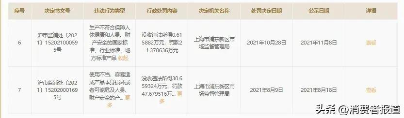 近三年被罚 7 次,因质量问题召回产品达 10 次