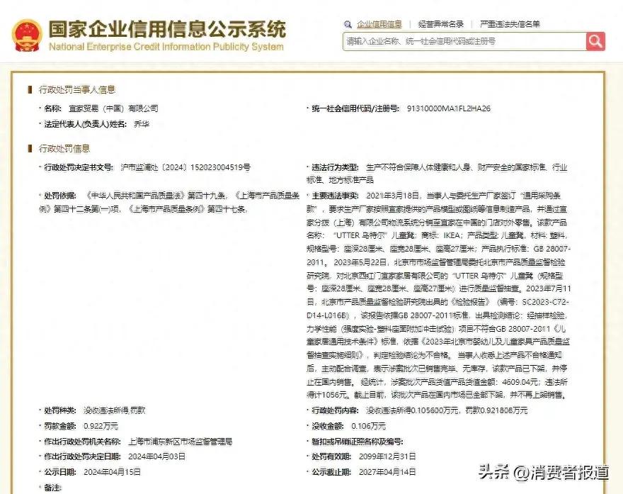 天眼查经营风险信息显示,近日,宜家贸易(中国)有限公司因生产不符合保障人体健康和人身、财产安全的标准产品,被上海市浦东新区市场监督管理局罚款 9218.08 元、没收违法所得 1056 元。因委托生产的 "UTTER 乌特尔 " 儿童凳检验结论为不合格。