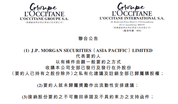 公告还指出,欧舒丹利用多家大型金融机构提供的融资来收购其剩余股份,机构包括黑石集团、高盛集团、法国农业信贷银行。