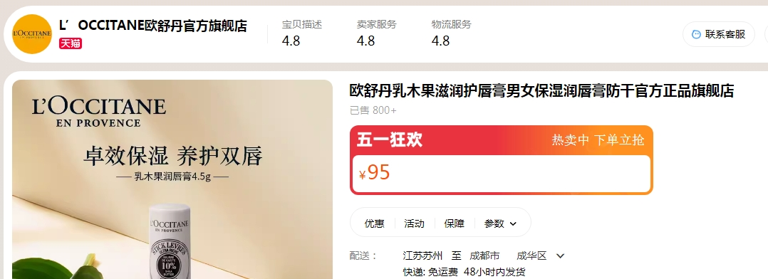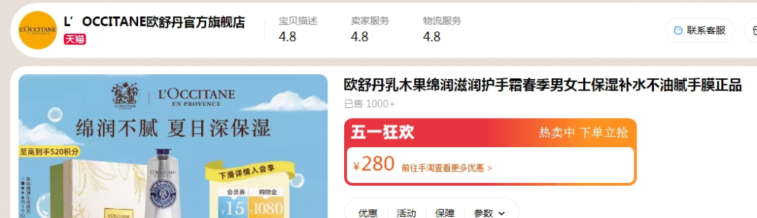 欧舒丹的定位是高端化妆品,在其天猫旗舰店,一支150ml的护手霜的价格最高达到280元,一支4.5克唇膏价格达95元。