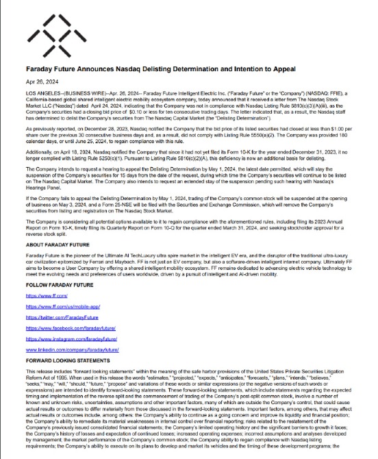 2024年4月24日,纳斯达克交易所指出,法拉第未来公司不符合纳斯达克上市规则第5810 (c)(3)(A)(iii) 条的规定,因为该公司证券连续十个交易日的收盘价为0.10美元或更低。