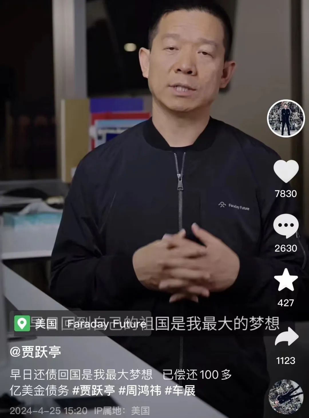 贾跃亭在视频中说,“昨天回应老周(周鸿祎)的视频引起了很多的讨论,我看了很多大家的留言,想就大家关心的问题做个回答。昨天老周问我何时回国,其实这恰恰是我最大的心结,也是我每天都在努力解决的问题,早日回到自己的祖国是我最大的梦想。任何能够挣钱还债、挣钱造车、造车还债、早日重归祖国的事情我都愿意努力去做,造车成功并还债之日,就是我回国之时。”