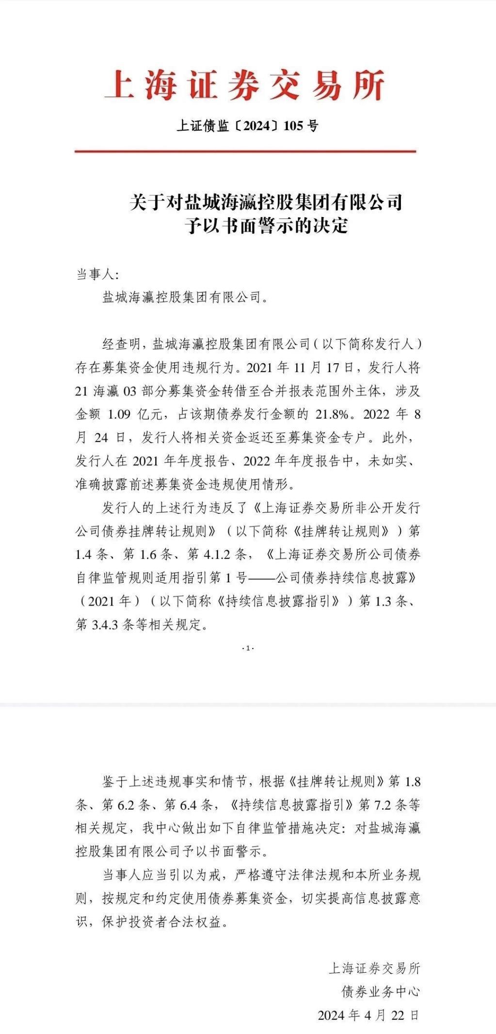4月22日,上海证券交易所关于对盐城海瀛控股集团有限公司予以书面警示的决定。