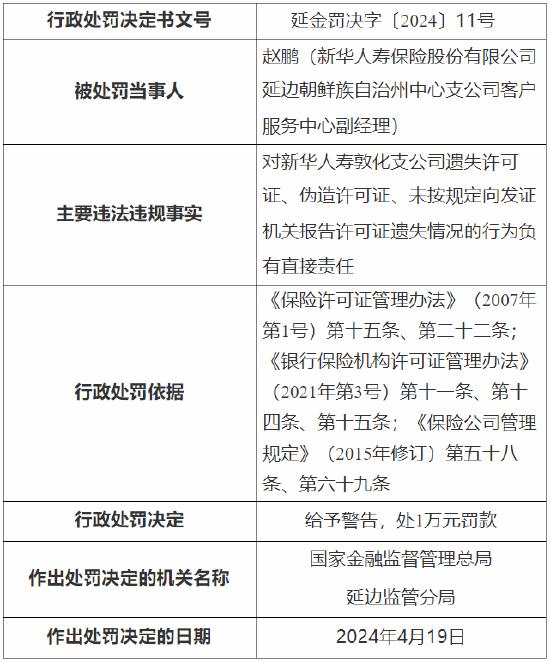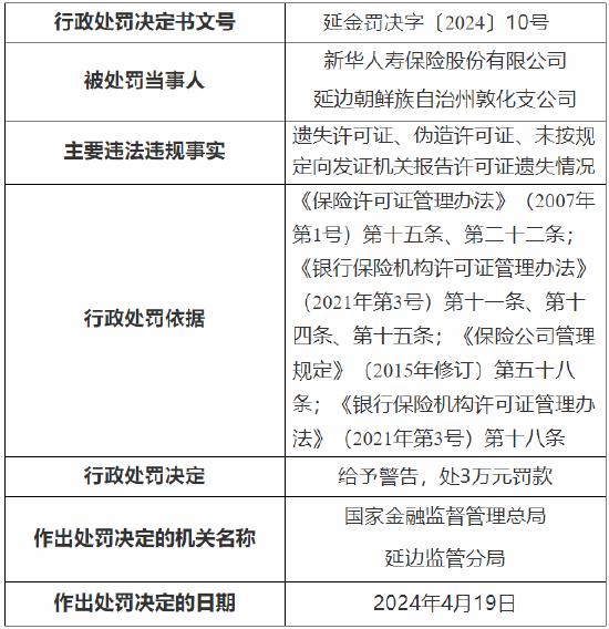 4月29日金融一线消息,国家金融监督管理总局延边监管分局行政处罚信息公开表显示,新华人寿保险股份有限公司延边朝鲜族自治州敦化支公司因存在遗失许可证、伪造许可证、未按规定向发证机关报告许可证遗失情况,被国家金融监督管理总局延边监管分局给予警告,处3万元罚款;一名直接责任人被给予警告并处1万元罚款。