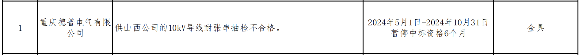 其中,重庆德普电气有限公司,供山西公司的10kV导线耐张串抽检不合格,被国网山西于2024年5月1日-2024年10月31日暂停中标资格6个月,处理范围为金具。