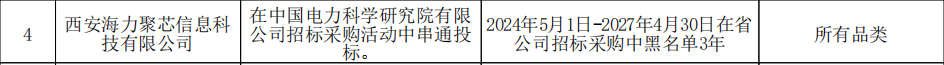 其中,西安海力聚芯信息科技有限公司,在中国电力科学研究院有限公司招标采购活动中串通投标。处理措施为:自2024年5月1日-2027年4月30日在省公司招标采购中黑名单3年。处理范围为:所有品类 。