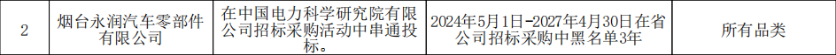其中,烟台永润汽车零部件有限公司,在中国电力科学研究院有限公司招标采购活动中串通投标。处理措施为:自2024年5月1日-2027年4月30日在省公司招标采购中黑名单3年。处理范围为:所有品类 。