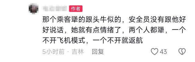 视频发布者发布了一段飞机上的视频,并配文称,“那个乘客犟得跟头牛似的,安全员没有跟他好好说话,他就有点情绪了,两个人都犟,一个不开飞行模式,一个不开就返航”。